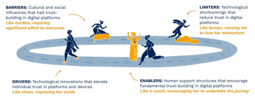 One of the key objectives of this study has been to uncover the barriers, limiters, enablers, and drivers of women’s digital trust. We focus our inquiry on the decision-making dimension to unbundle these.